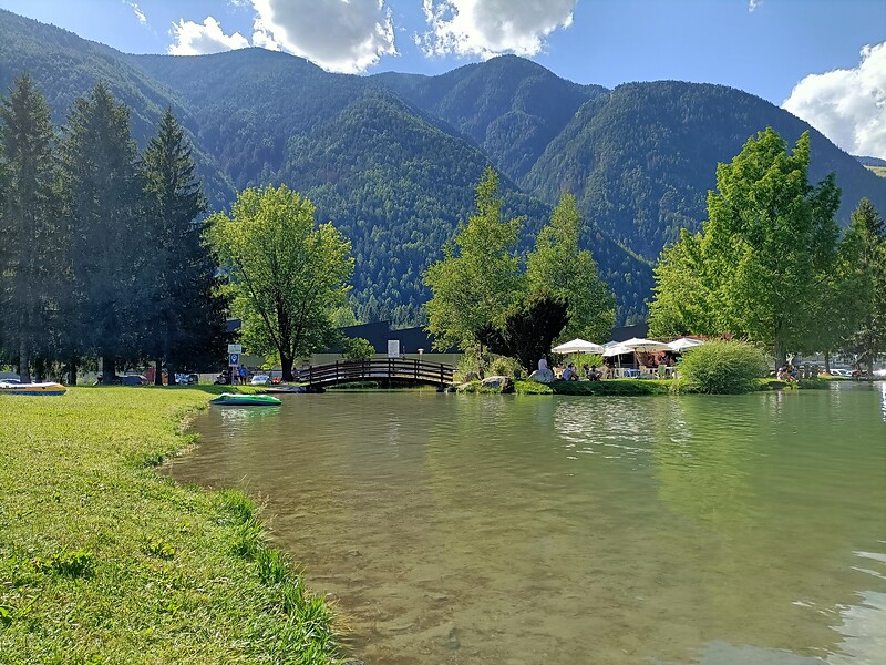 Schöner Badesee für Groß und Klein in Gais in der Nähe des Radweges mit Liegewiese und Bar.