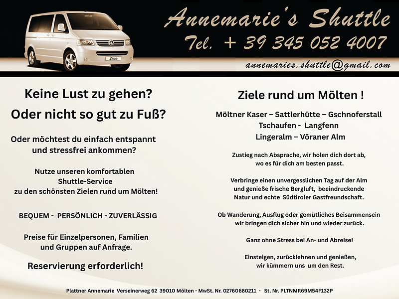 Mit Annmarie's Shuttle ist es ein Leichtes schnell von einem Punkt zum Nächsten zu kommen. Einmal angerufen bringt Sie Annemarie mit ihrem Shuttle schnell und komforabel zu ihrem Zielort.